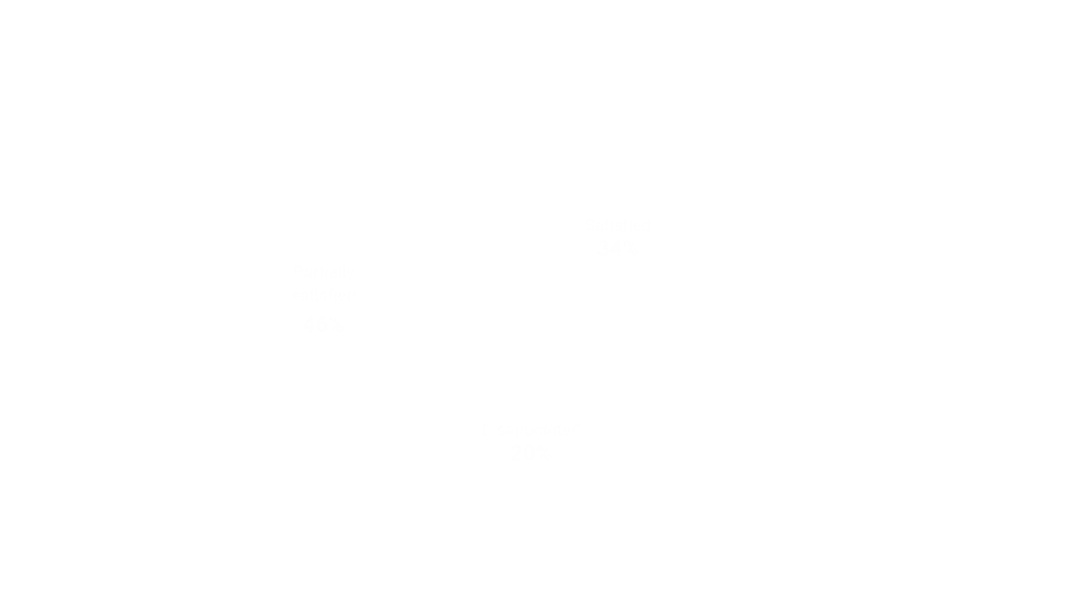 Satisfaction with GenAI outcomes remains uneven. Only 34% of respondents report being satisfied with the value generated . Nearly half indicate partial satisfaction, while one in five report disappointment. Relative to initial framing and investment, while 46% indicate partial satisfaction and 20% report disappointment. These figures underline a clear gap between expectations and realized outcomes.